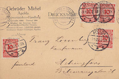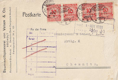 Inlandspostkarte vom 02.11.1923 (22. Periode) frankiert mit 4 Marken a 10 Millionen Mark (=40 Millionen Mark) |
