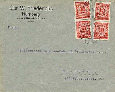 Ortsbrief (1-20 g) vom 02.11.1923 (22. Periode) frankiert mit 4 Marken a 10 Millionen Mark (=40 Millionen Mark) |