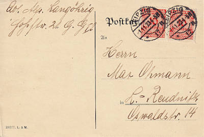 Ortspostkarte vom 01.11.1923 (22. Periode) frankiert mit 2 Marken a 10 Millionen Mark (=20 Millionen Mark) |