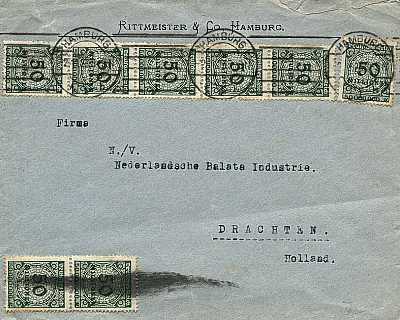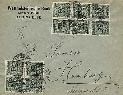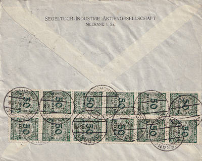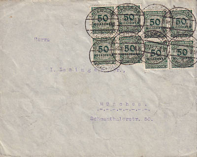 Auslandsbrief (1-20 g) vom 03.11.1923 (22. Periode) frankiert mit 4 Marken a 50 Millionen Mark (=200 Millionen Mark) |