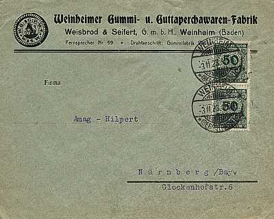 Inlandsbrief (1-20 g) vom 03.11.1923 (22. Periode) frankiert mit 2 Marken a 50 Millionen Mark (=100 Millionen Mark) |