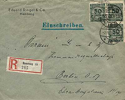 Inlandsbrief mit Einschreiben (1-20 g) vom 01.11.1923 (22. Periode) frankiert mit 3 Marken a 50 Millionen Mark (=150 Millionen Mark, 100 Millionen Brief 50 Millionen Einschreiben) |