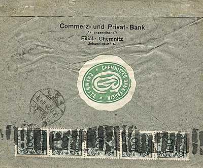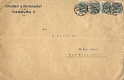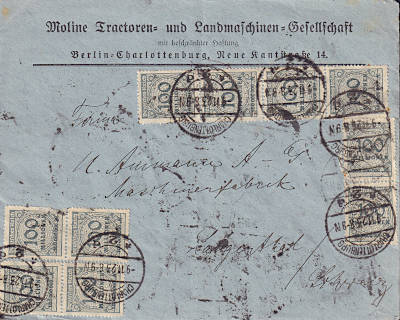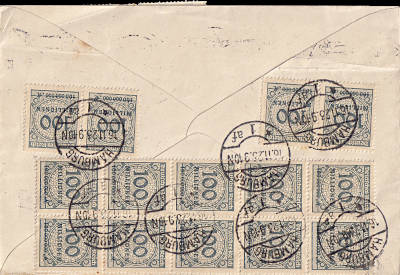 Auslandsbrief (41-60 g) vom 03.11.1923 (22. Periode) frankiert mit 4 Marken a 100 Millionen Mark (=400 Millionen Mark) |