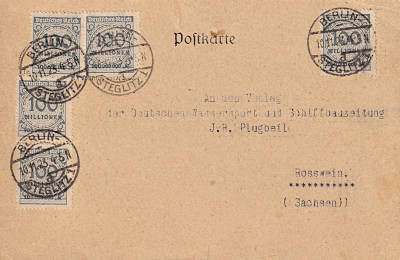 Ortspostkarte vom 07.11.1923 (23. Periode) frankiert mit 2 Marken a 100 Millionen Mark (=200 Millionen Mark) |