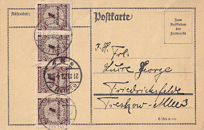 Ortspostkarte vom 21.11.1923 (25. Periode) frankiert mit 4 Marken a 1 Milliarde Mark (=4 Milliarden Mark) |
