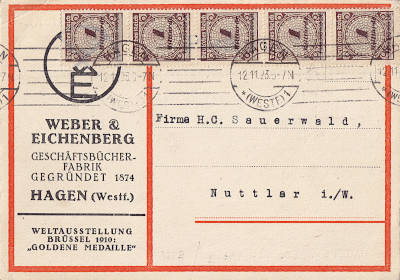 Inlandspostkarte vom 12.11.1923 (24. Periode) frankiert mit 5 Marken a 1 Milliarde Mark (=5 Milliarden Mark) |