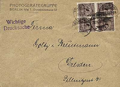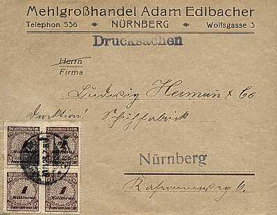 Inlandsdrucksache (1-25 g) vom 20.11.1923 (25. Periode) frankiert mit 4 Marken a 1 Milliarde Mark (=4 Milliarden Mark) |