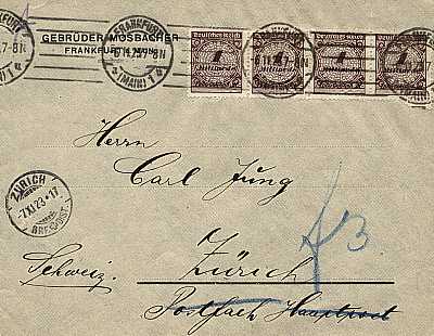 Auslandsbrief (1-20 g) vom 06.11.1923 (23. Periode) frankiert mit 4 Marken a 1 Milliarde Mark (=4 Milliarden Mark) |