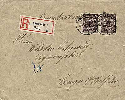 Inlandsbrief mit Einschreiben (1-20 g) vom 10.11.1923 (23. Periode) frankiert mit 2 Marken a 1 Milliarde Mark (=2 Milliarden Mark, 1 Milliarde Brief 1 Milliarde Einschreiben) |