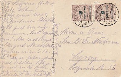 Inlandspostkarte vom 23.11.1923 (25. Periode) frankiert mit 5 Marken a 2 Milliarden Mark (=10 Milliarden Mark) |