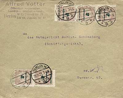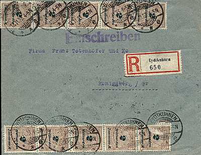 Inlandsbrief mit Einschreiben (1-20 g) vom 17.11.1923 (24. Periode) frankiert mit 10 Marken a 2 Milliarden Mark (=20 Milliarden Mark, 10 Milliarden Brief 10 Milliarden Einschreiben) |