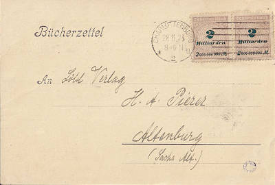 Inlandsbücherzettel (1-25 g) vom 28.11.1923 (26. Periode) frankiert mit 2 Marken a 2 Milliarden Mark (=16 Milliarden Mark) |
