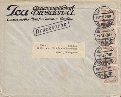 Auslandsdrucksache (1-50 g) vom 19.11.1923 (24. Periode) frankiert mit 4 Marken a 2 Milliarden Mark (=8 Milliarden Mark) |