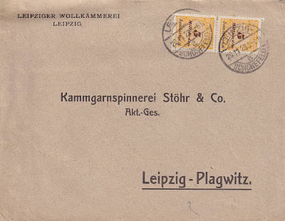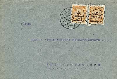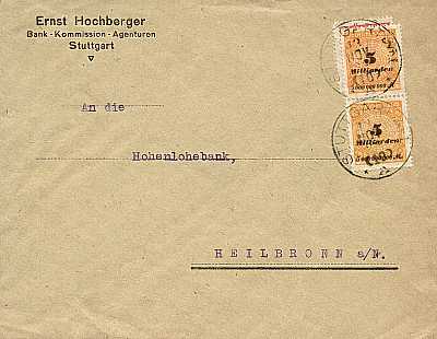 Inlandsbrief (1-20 g) vom 13.11.1923 (24. Periode) frankiert mit 2 Marken a 5 Milliarden Mark (=10 Milliarden Mark) |