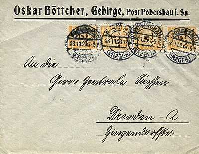 Inlandsbrief (1-20 g) vom 28.11.1923 (26. Periode) frankiert mit 4 Marken a 5 Milliarden Mark (=80 Milliarden Mark) |