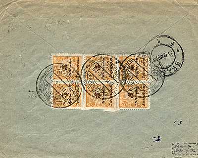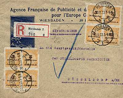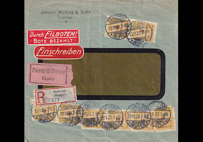 Inlandsbrief mit Einschreiben und Eilzustel- lung (1-20 g) vom 13.11.1923 (24. Periode) frankiert mit 8 Marken a 5 Milliarden Mark (=40 Milliarden Mark, 10 Milliarden Brief 10 Milliarden Einschreiben 20 Milliarden Eilzustellung) |