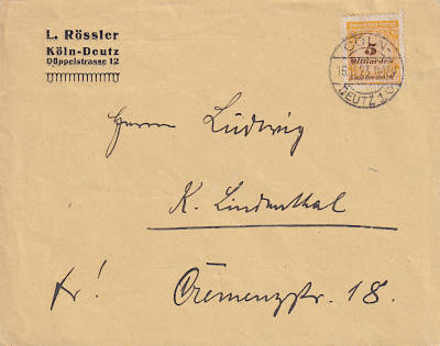 Inlandsbrief (1-20 g) vom 15.11.1923 (24. Periode) frankiert mit 2 Marken a 5 Milliarden Mark (=10 Milliarden Mark) |