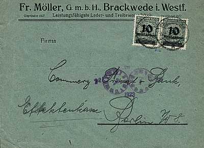 Inlandsbrief (1-20 g) vom 20.11.1923 (25. Periode) frankiert mit 2 Marken a 10 Milliarden Mark auf 50 Millionen Mark (=20 Milliarden Mark) |