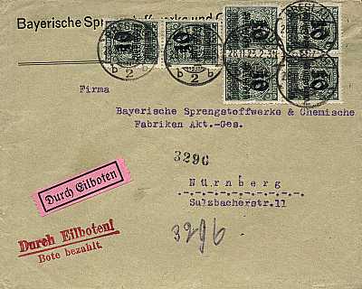 Inlandsbrief mit Eilzustellung (1-20 g) vom 28.11.1923 (26. Periode) frankiert mit 6 Marken a 10 Milliarden Mark auf 50 Millionen Mark (=240 Milliarden Mark, 80 Milliarden Brief 160 Milliarden Eilzustellung) |