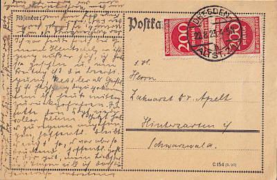 Inlandspostkarte vom 22.08.1923 (15. Periode) frankiert mit 2 Marken a 200 Mark (=400 Mark) |