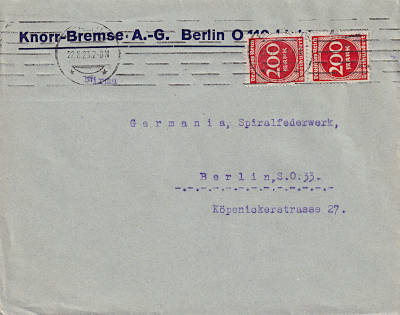 Ortsbrief (1-20 g) vom 22.08.1923 (15. Periode) frankiert mit 2 Marken a 200 Mark (=400 Mark) |