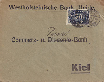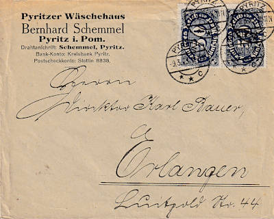 Inlandsbrief (1-20 g) vom 09.03.1923 (13. Periode) frankiert mit 2 Marken a 50 Mark (=100 Mark) |