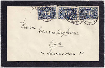 Auslandsbrief (1-20 g) vom 28.01.1923 (12. Periode) frankiert mit 3 Marken a 50 Mark (=150 Mark) |
