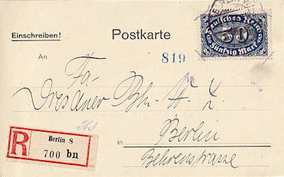 Ortspostkarte mit Einschreiben vom 28.01.1923 (12. Periode) frankiert mit einer Marke a 50 Mark (=50 Mark, 10 Postkarte 40 Einschreiben) |