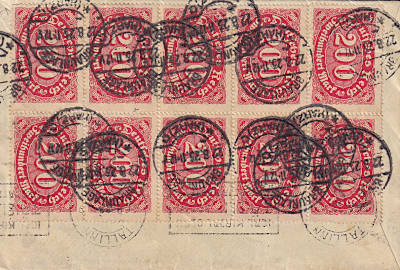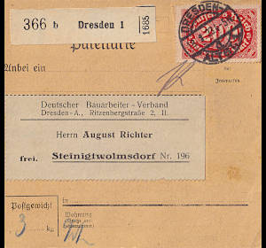 Inlandspaketkarte (2 500 g, > 75 km) vom 15.01.1923 (12. Periode) frankiert mit 2 Marken a 200 Mark (=400 Mark) |