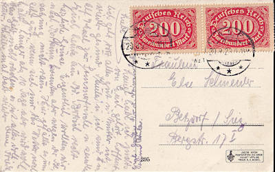 Inlandspostkarte vom 20.08.1923 (15. Periode) frankiert mit 2 Marken a 200 Mark (=400 Mark) |