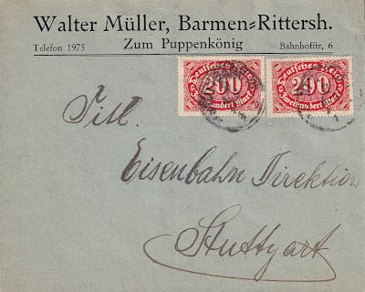 Inlandsbrief mit Einschreiben (1-20 g) vom 27.07.1923 (14. Periode) frankiert mit 2 Marken a 200 Mark (=600 Mark, 300 Brief 300 Einschreiben) |