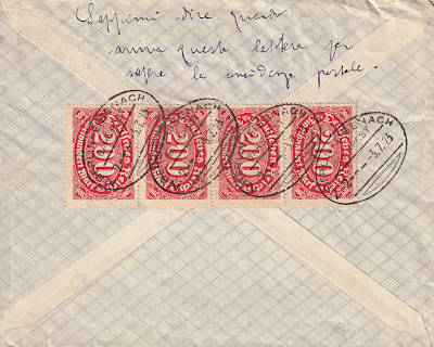 Auslandsbrief (1-20 g) vom 03.07.1923 (14. Periode) frankiert mit 4 Marken a 200 Mark (=800 Mark) |