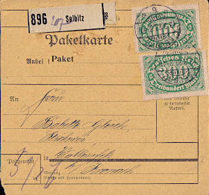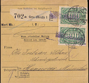 Inlandspaketkarte (1 000 g, > 75 km) vom 04.04.1923 (13. Periode) frankiert mit 2 Marken a 300 Mark (=600 Mark) |