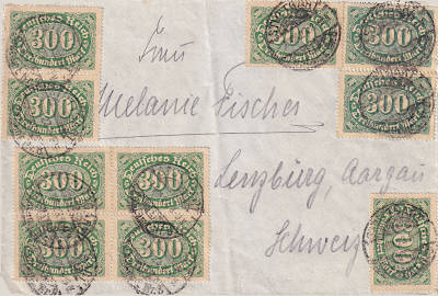 Auslandsbrief (1-20 g) vom 07.08.1923 (15. Periode) frankiert mit 10 Marken a 300 Mark (=3 000 Mark) |