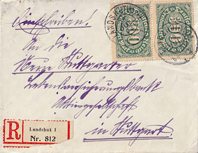 Inlandsbrief mit Einschreiben (1-20 g) vom 28.07.1923 (14. Periode) frankiert mit 2 Marken a 300 Mark (=600 Mark, 300 Brief 300 Einschreiben) |