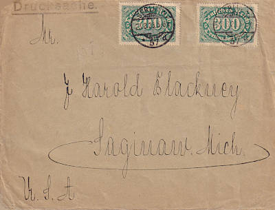 Auslandsdrucksache (1-50 g) vom 23.08.1923 (15. Periode) frankiert mit 2 Marken a 300 Mark (=600 Mark) |