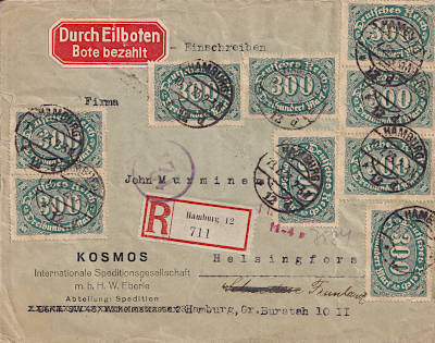 Auslandsbrief mit Einschreiben und Eilzustel- lung (1-20 g) vom 10.07.1923 (14. Periode) frankiert mit 9 Marken a 300 Mark (=2 700 Mark, 800 Brief 300 Einschreiben 1 600 Eilzustellung) |