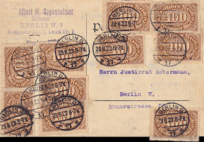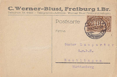 Inlandspostkarte vom 15.08.1923 (15. Periode) frankiert mit einer Marke a 400 Mark (=400 Mark) |