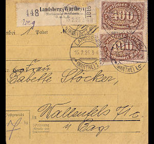 Inlandspaketkarte (7 000 g, > 75 km) vom 15.02.1923 (12. Periode) frankiert mit 2 Marken a 400 Mark (=800 Mark) |