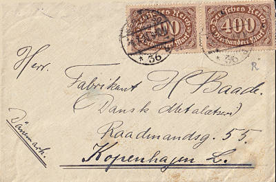 Auslandsbrief (1-20 g) vom 06.07.1923 (14. Periode) frankiert mit 2 Marken a 400 Mark (=800 Mark) |