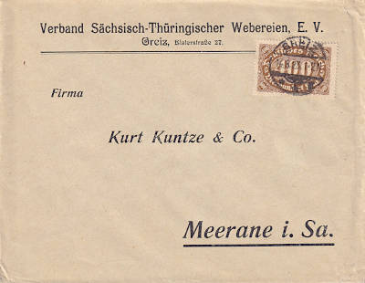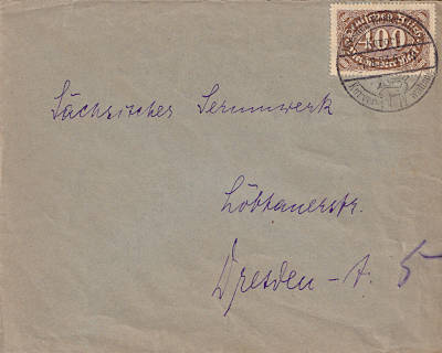 Ortsbrief (1-20 g) vom 07.08.1923 (15. Periode) frankiert mit einer Marke a 400 Mark (=400 Mark) |