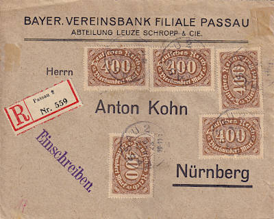 Inlandsbrief mit Einschreiben (1-20 g) vom 23.08.1923 (15. Periode) frankiert mit 5 Marken a 400 Mark (=2 000 Mark, 1 000 Brief 1 000 Einschreiben) |