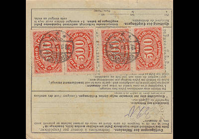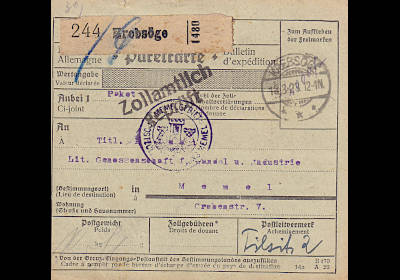 Auslandspaketkarte (10 000 g, > 75 km) vom 13.03.1923 (13. Periode) frankiert mit 4 Marken a 500 Mark (=2 000 Mark); in das Memelgebiet galt der Inlandstarif |