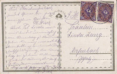 Inlandspostkarte vom 23.06.1923 (13. Periode) frankiert mit 2 Marken a 20 Mark (=40 Mark) |
