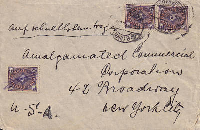 Auslandsbrief (21-40 g) vom 07.12.1922 (10. Periode) frankiert mit 3 Marken a 20 Mark (=60 Mark) |