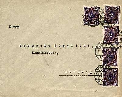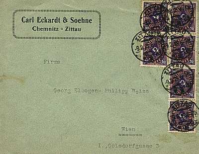 Auslandsbrief (1-20 g) vom 10.01.1923 (11. Periode) frankiert mit 4 Marken a 20 Mark (=80 Mark) |