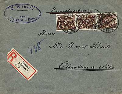 Inlandsbrief mit Einschreiben (1-20 g) vom 09.02.1923 (12. Periode) frankiert mit 3 Marken a 30 Mark (=90 Mark, 50 Brief 40 Einschreiben) |