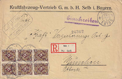 Inlandsbrief mit Einschreiben (1-20 g) vom 07.05.1923 (13. Periode) frankiert mit 6 Marken a 30 Mark (=180 Mark, 100 Brief 80 Einschreiben) |