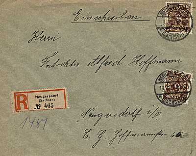 Ortsbrief mit Einschreiben (1-20 g) vom 13.02.1923 (12. Periode) frankiert mit 2 Marken a 30 Mark (=60 Mark, 20 Brief 40 Einschreiben) |