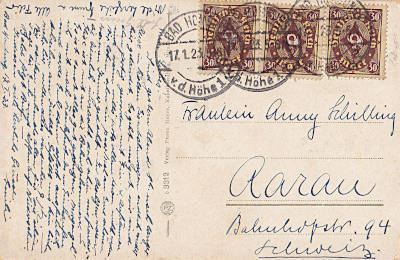 Auslandspostkarte vom 17.01.1923 (12. Periode) frankiert mit 3 Marken a 30 Mark (=90 Mark) |